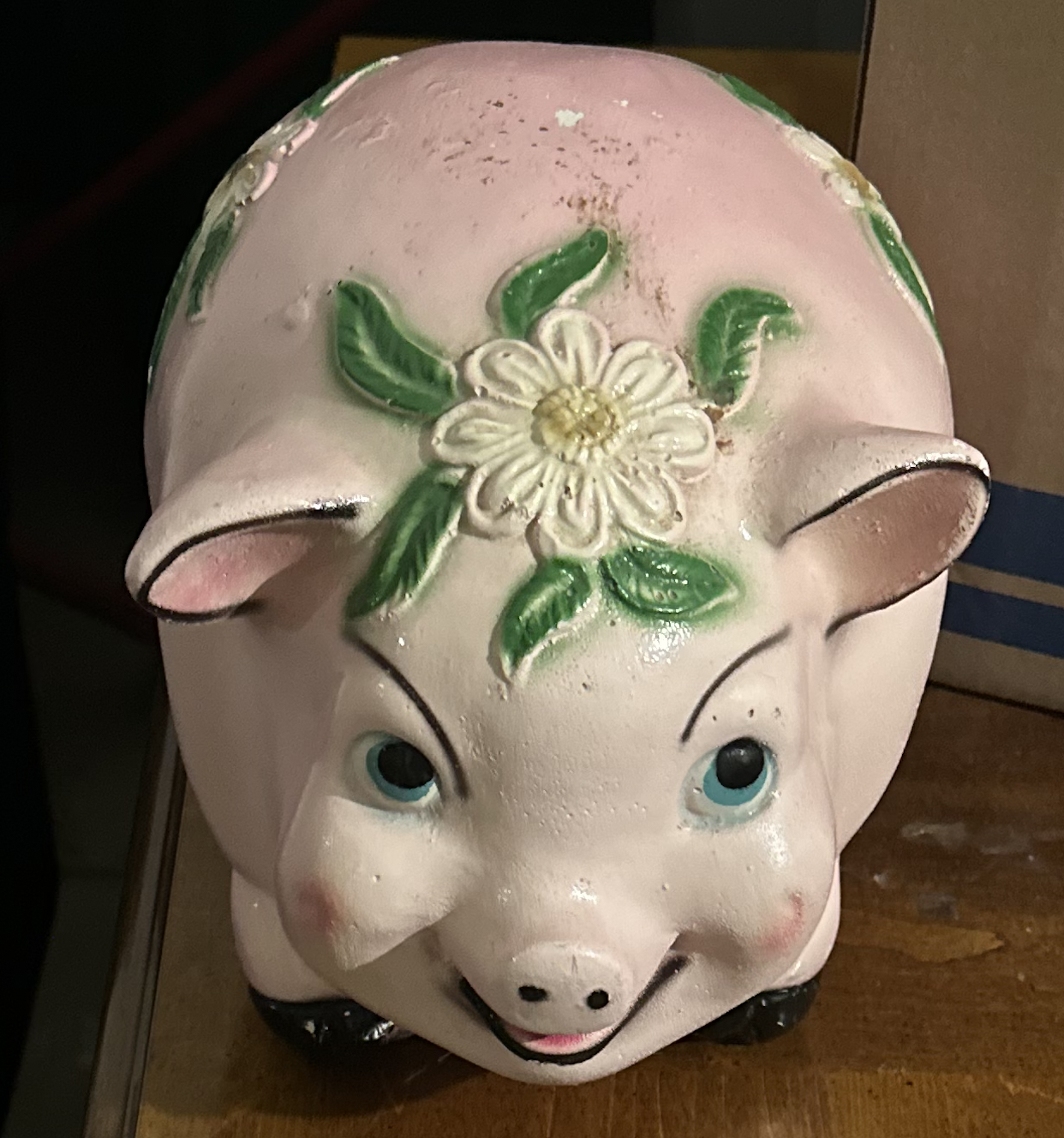 Upon landing on American soil, one of his first purchases was a piggy bank. Roughly the length of a standard textbook. Its face is painted with blue eyes staring lazily up, mismatched black lines along the top of the eyes granting it the appearance of eyebrows. Along the top, there are three white flowers circled with green leaves. The coin slot is in the back, in lieu of a tail. On the bottom, a crack that has seen been mended with a glued layer of plastic mesh. It was one of the first purchases he made in order to budget money so he could support his family. Being one of the primary supporters of his family, what money he had for himself he would save.
